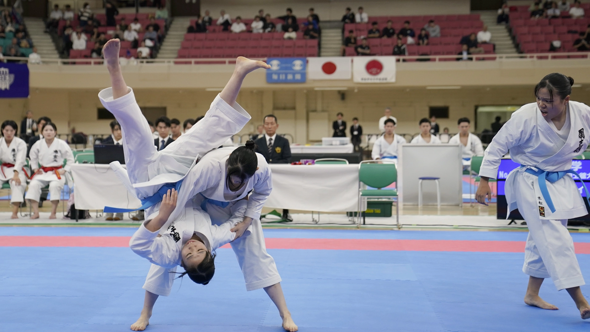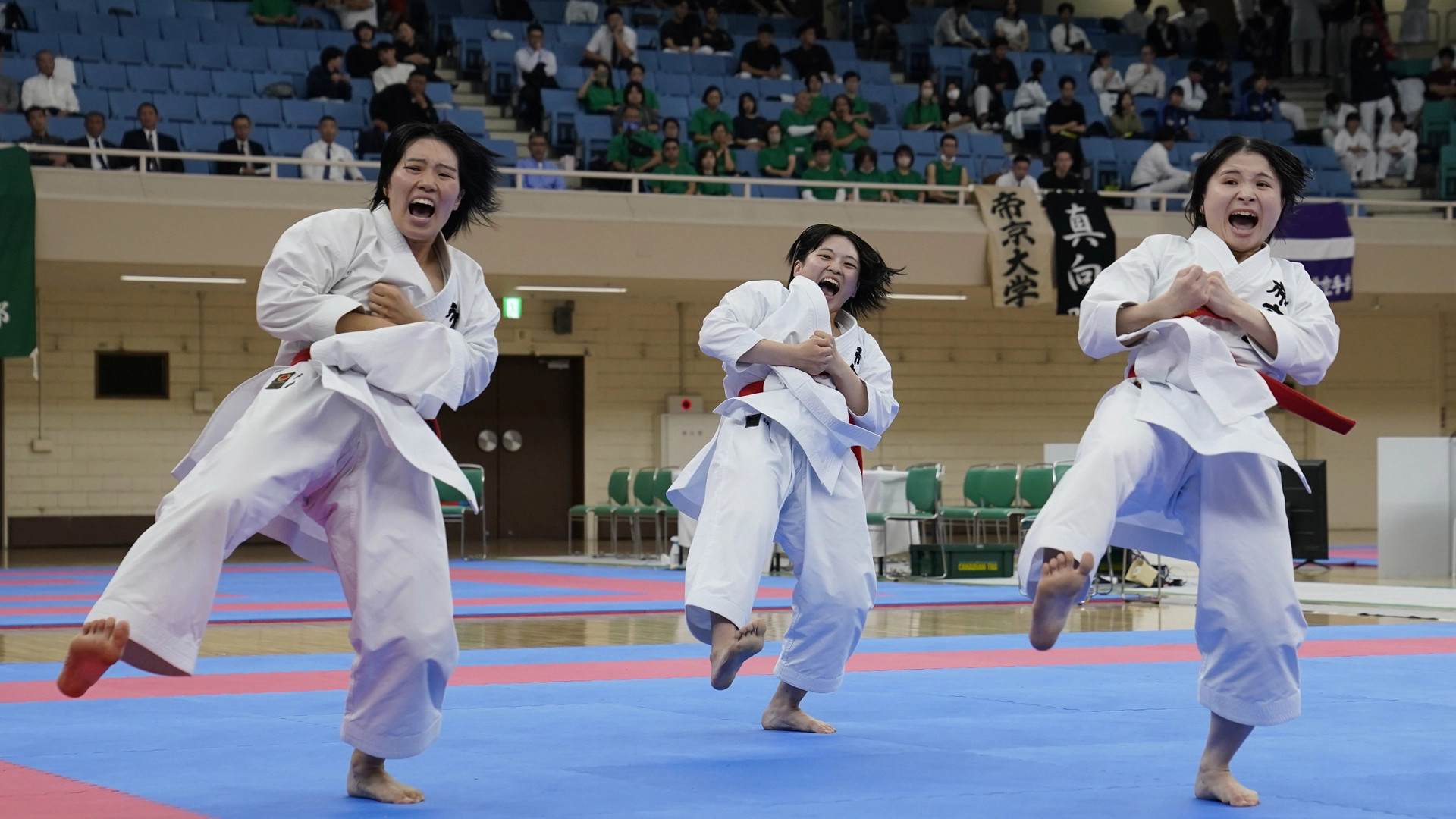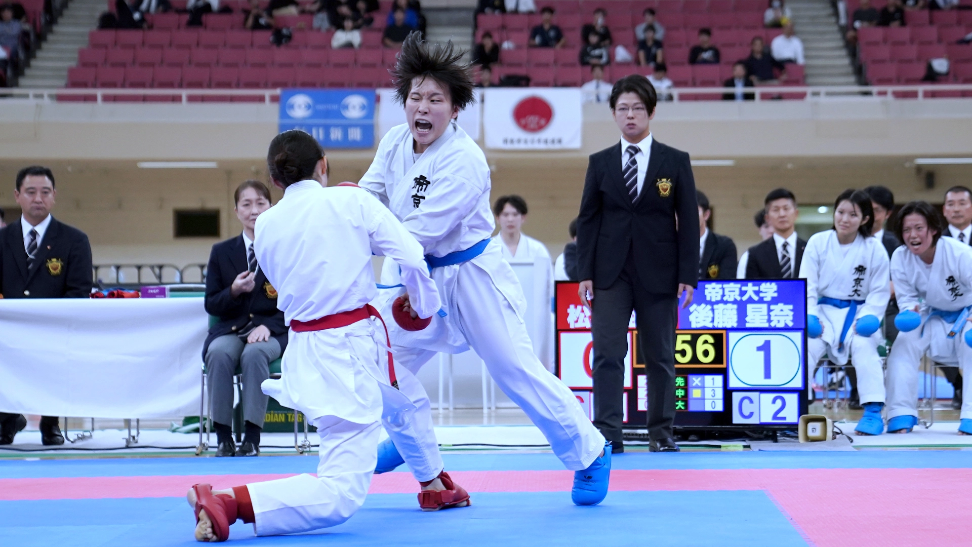 女子団体組手は32校がエントリー。決勝に勝ち進んだのは、帝京大学と国士舘大学。意地と意地がぶつかり合う激戦を制したのは青の帝京大学で4年ぶりとなる13回目の優勝。