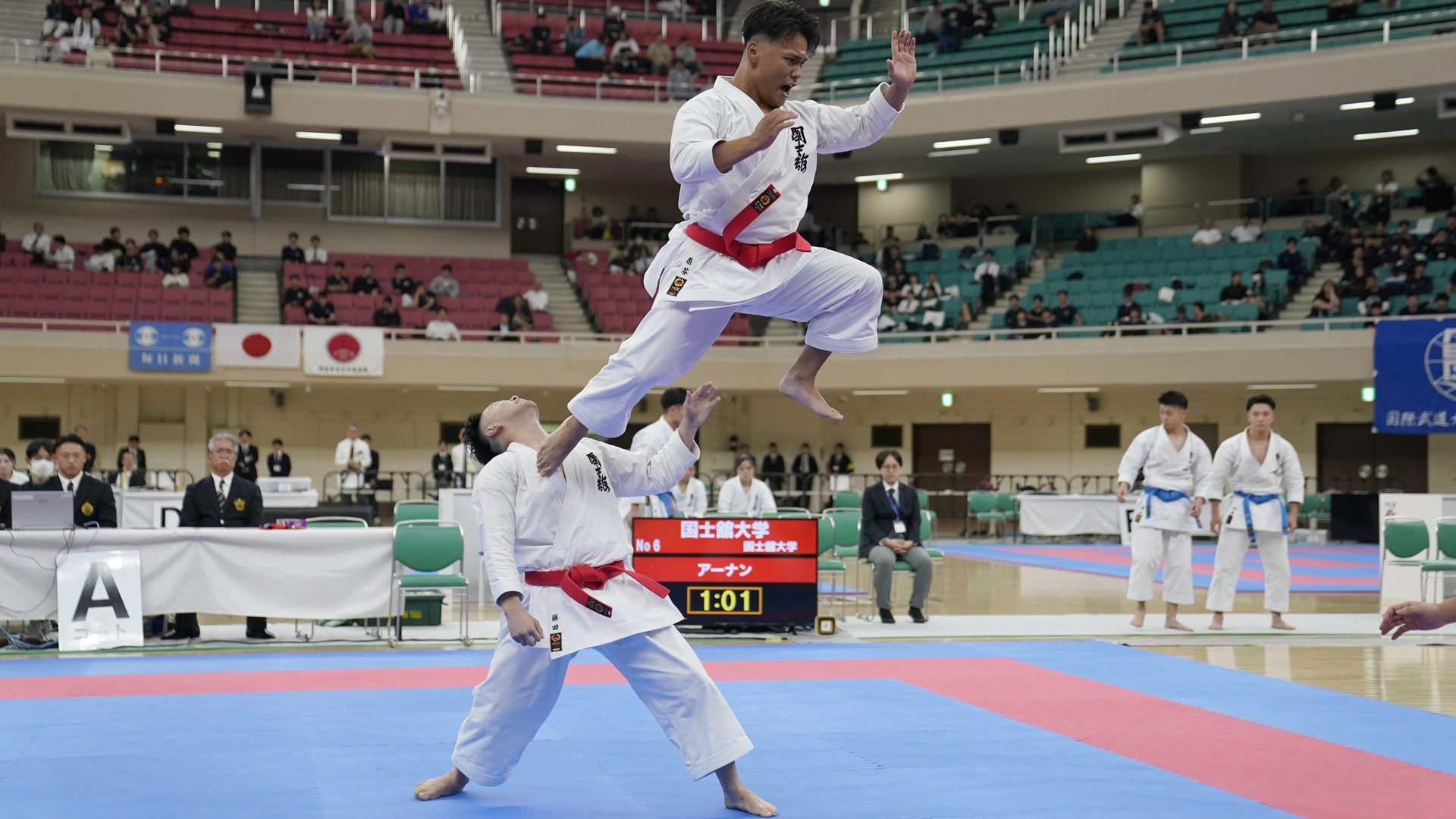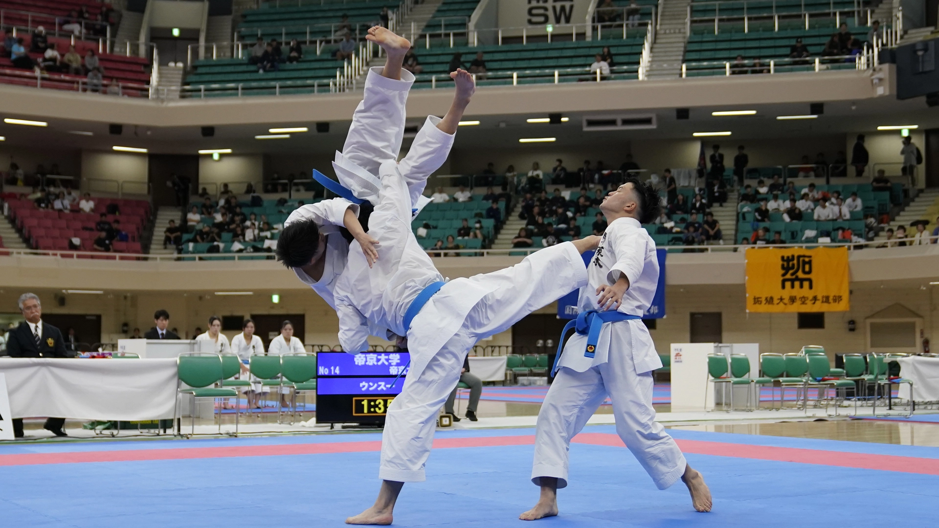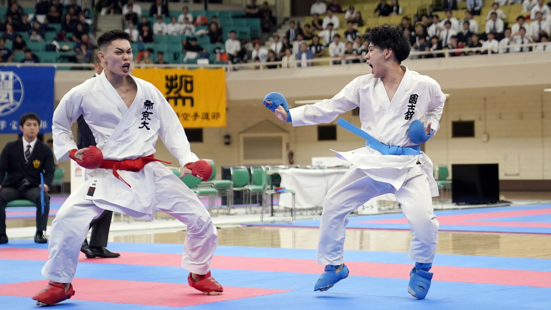 男子団体組手は34校がエントリーし、決勝戦に駒を進めたのは、女子に続いて帝京大学と国士舘大学。試合は引き分けを挟んで大将戦までもつれるも軍配は3-1で青の国士舘大学に上がり、23年ぶり4度目の優勝となった。